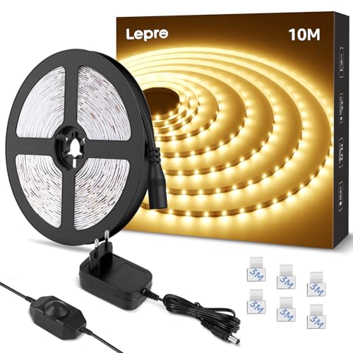 Lepro LED-remsa 10 m varm vit, LED-remsa varm vit 3 000 K dimbar, 600 lysdioder 2835 LED-band självhäftande, superljus LED-ljusband list med strömförsörjning, ljuskedja kedja för inomhus kök hem dekoration