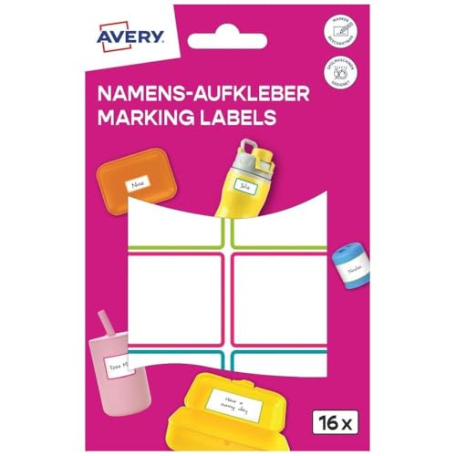 AVERY Zweckform NAME16C namnklistermärken barn vattentäta 16 stycken (35 x 36 mm, folie, självhäftande namnetiketter, skrivbara namnskyltar, diskmaskinssäkra, för skola, dagis) färgglada