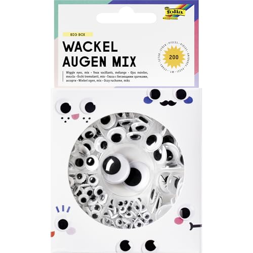 folia 7549-Mix Big Box Fluga Eyes, 200 klassiska glasögon i 6 storlekar, inklusive Ø 14 mm med ögonfransar, självhäftande, för dekoration och utsmyckning, svart/vit, Ø 5, 7, 10, 12, 14 och 20 mm