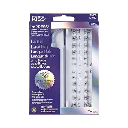 KISS imPRESS Falsies Long Lasting självhäftande ögonfransar, "Demi Edgy", 5 dagars förlängd användningstid, 24 naturliga volymögonfranskluster (5, 6, 8, 10, 12 och 14 mm), exakt non-stick applikator