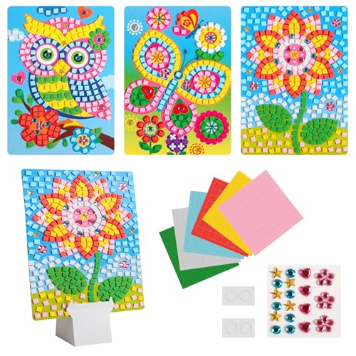 3 stycken mosaik pysselset barn, mosaik set klistermärken färger skumgummi pysselset barn 4 år, mosaik självhäftande bilder för flickor pojkar, klibbig mosaik blommor fjäril uggla gör-det-själv
