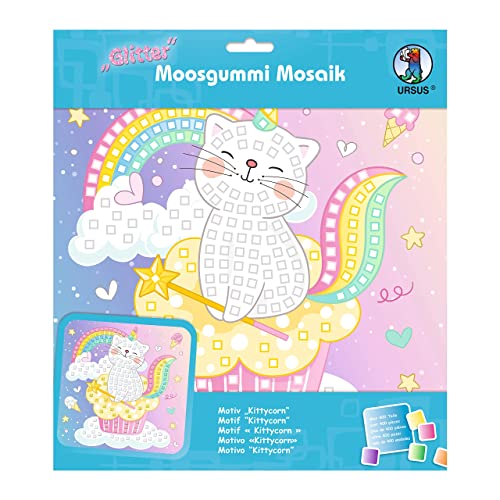 Ursus 8420018 – Glitter skumgummi, mosaikbild "Kittycorn", pysselset för en självhäftande bild av skumgummiklistermärken, ca 25 x 25 cm med stativ