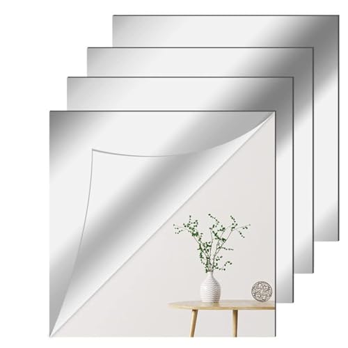 Bosdontek 4 stycken spegelfolie självhäftande, 20 x 20 cm akryl självhäftande spegel flexibel spegel självhäftande spegelplattor, dekorativ väggspegel spegel spegel självhäftande spegel för väggen,