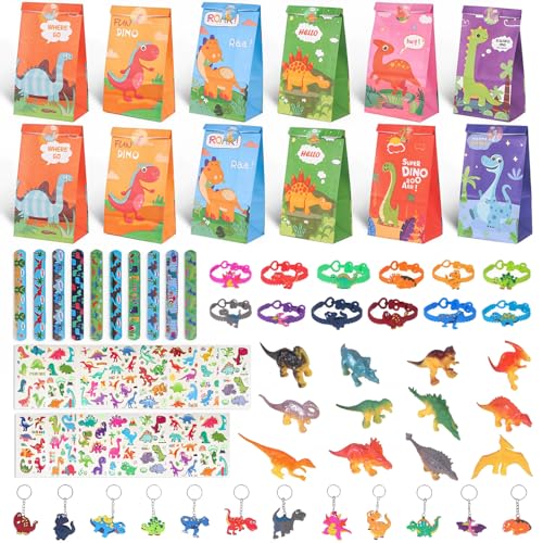 Dinosaurie Party Favors 73PCS för 10 barn, Dino Party bag birthday Supplies, goodie partern bags med matchande klistermärken, nyckelring och självlysande tatueringsklistermärken, lämplig för Halloween
