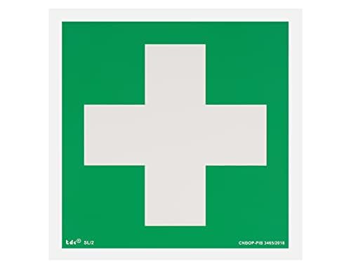 notlok Safety Work – första hjälpen skylt – vitt kors [ 15 x 15 cm] | Självlysande plastplatta klistermärken för enkel montering | DIN EN ISO 7010 | Klistermärke för medicin, säkerhetsskyltar