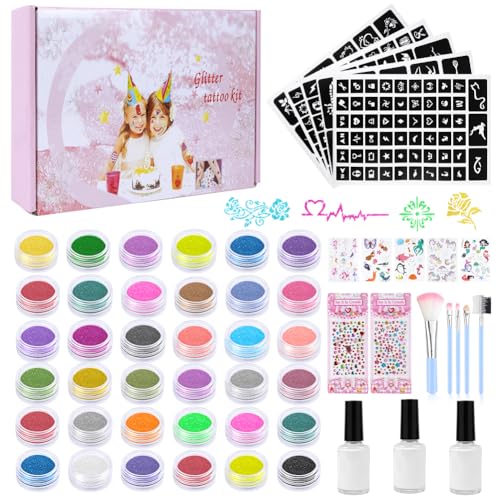 AYBUY glittertatueringar för barn, 36 färger tillfälliga glittertatueringar, presenter till födelsedagsfest Cosplay, 5 schabloner, 5 tecknade självlysande klistermärken, 5 penslar, 2 ädelstensdekal