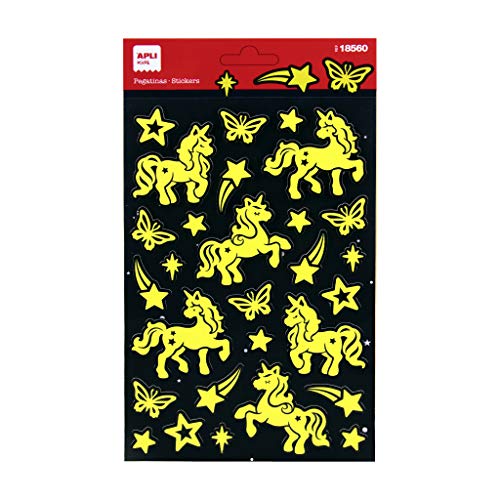 APLI Kids 18560-Klistermärken med självlysande finish Enhörningsmodell, Glöd i mörkret. Inkluderar 1 ark med 26 Permanent Självhäftande Klistermärken (18560)