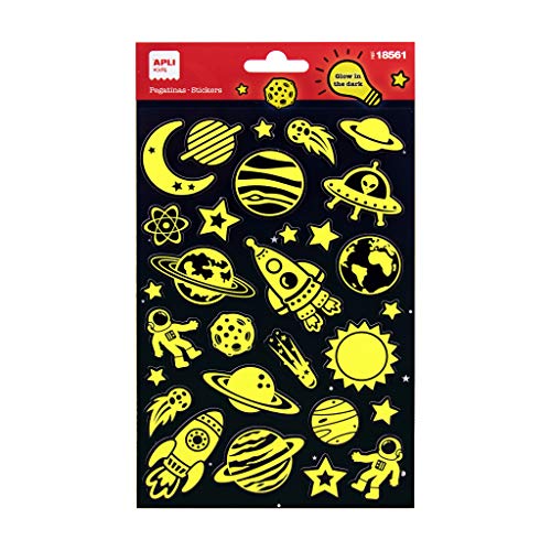 APLI Kids 18561-Klistermärken med självlysande efterbehandling Modell Space, Glöd i mörkret. Inkluderar 1 ark med 26 Permanent Klistermärken, Multicolor (18561)