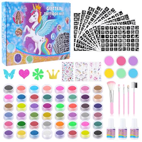 AYBUY glittertatueringar för barn, 54 färger temporära glittertatueringar, presenter till fest Cosplay Halloween jul, 10 schabloner, 6 självlysande pulver, 2 självlysande klistermärken