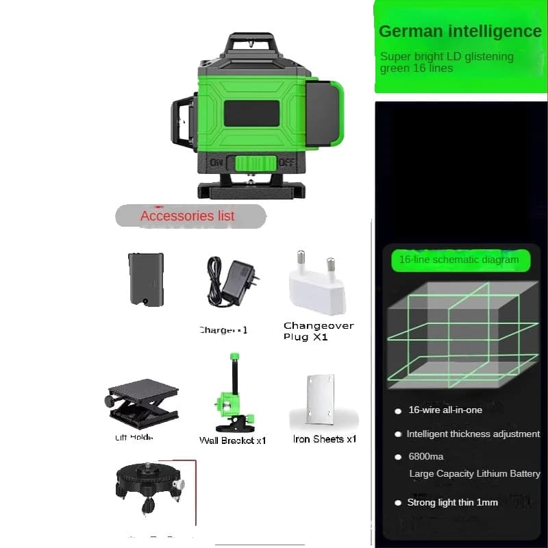 Laser Nivåinstrument, 360° 3D/4D, Självnivellerande Teknologi, Grön Laser, 16 linjer