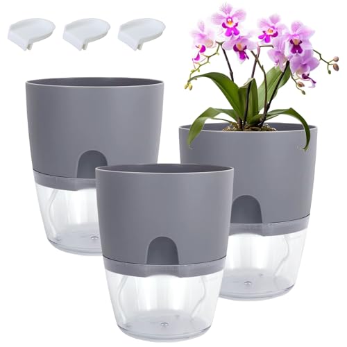 Fhioevt Set med 3 inomhusblomkruka, självvattnande kruka, med dräneringshål och bevattningssystem, vattenbehållare, små plastblomkrukor, för växter, örtkruka (grå)