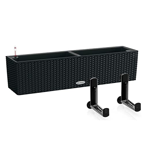 Lechuza Självvattnande kruka BALCONERA stuga 80 granit plast balkongplanterare för räcke rotting look planterare H19 L 80 B 19 cm bunt med svarta balkongfästen