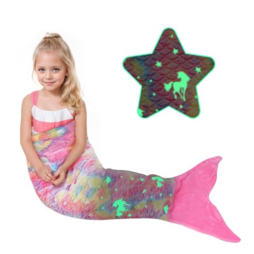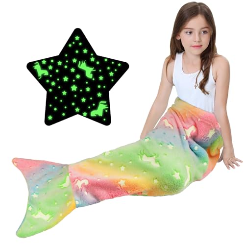 TOKIISHE Sjöjungfru stjärtfilt, 100 x 50 cm bärbar sjöjungfru som lyser i mörkret filt för flickor presenter, handgjord stickad mjuk varm flanell sovsäck för flickor tonåringar födelsedag jul