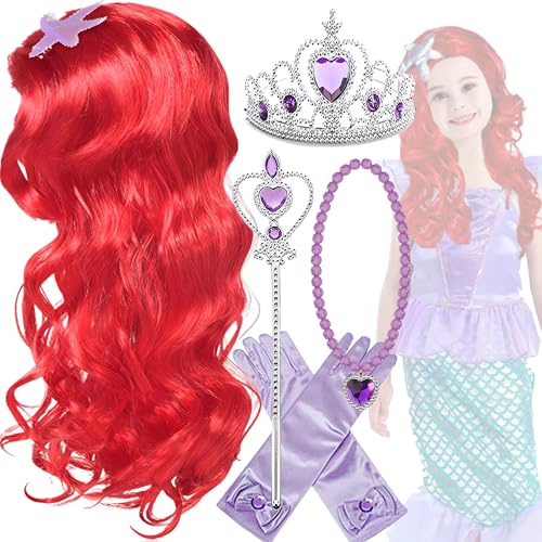 CXAFQ 5 stycken sjöjungfru-tillbehör, inklusive röd peruk, krona, handskar, halsband, trollstav, rollspelspresent till barn för påsk (utan svans, utan kläder)