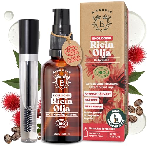 EKOLOGISK RICINOLJA | 100% Ren, Naturlig & Kallpressad | Fransar, Bryn, Kropp, Hår, Skägg, Naglar | Vegan & Cruelty Free | Castor Oil | Glasflaska + Pipett + Pump + Mascara-kit (50ml)