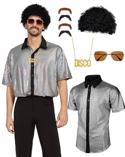 70-tals disco kostym set hippie män outfit med toppar glasögon falska skägg halsband peruker 80-talet karneval förhänge för 50-talet 60-talet 70-talet cosplay halloweenfest (silver, L)