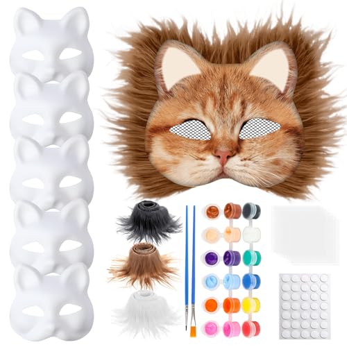Hullen Kattmasker för målning, 6 djurkattmasker, gör-det-själv-set med ögon, meshpäls, skägg och ädelsten, klistermärken