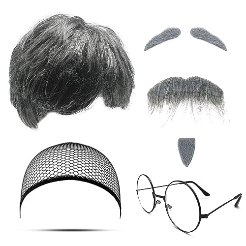 MIVAIUN 7-Delad Morfar Kostym Set - Gammal Man Kostym Med Tillbehör - Peruk, Grått Skägg, Ögonbryn, Perukhätta, Glasögon För Halloween Fest Karneval