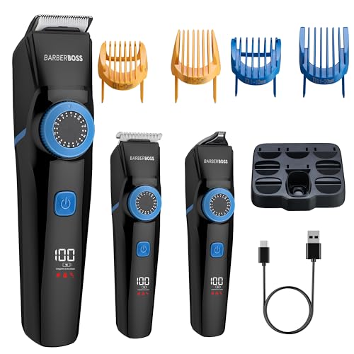 BarberBoss skäggtrimmer för män, 3-i-1 hår-, skägg- och detaljtrimmer, LED-skärm, 3 skärhuvuden, USB-laddning och vattentät design, uppladdningsbart skötselkit med precisionsurtavla