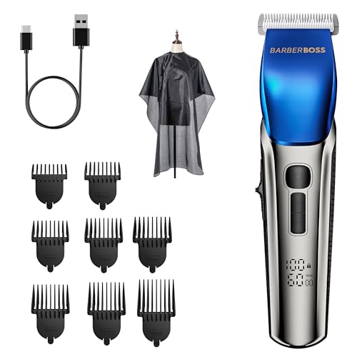 BarberBoss hårklippare och skäggtrimmer för män – 4 hastighetsinställningar, keramiska blad, 8 styrkammar, LED-display, USB-laddningsbar, vattentät