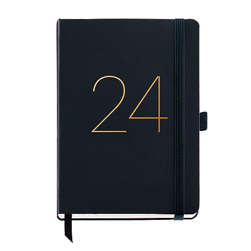 Miquelrius - Årlig dagordning 2024, Vecka Vista, Plus storlek 155 x 213 mm (liknande A5), styvt skal sylt hud, elastiskt gummi, katalanska, engelska och portugisiska, Svart