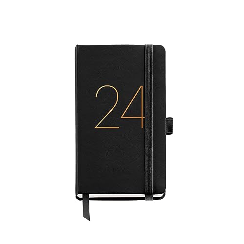 Miquelrius - Årlig dagordning 2024, Dag sida, Passport storlek 90 x 140 mm, styvt skal sylt hud, elastiskt gummi, spanska, engelska och portugisiska, Svart