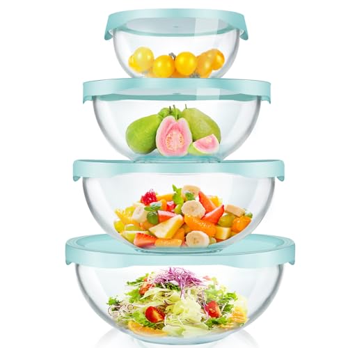 Luvan Högborsilikat klart glas blandningsskålar med lock uppsättning av 4 (0,5 L, 1,4 L, 2,4 L, 3,3 L köks- och utrymmesbesparande skålar, stora glassalladsskålar för bakning, blandning