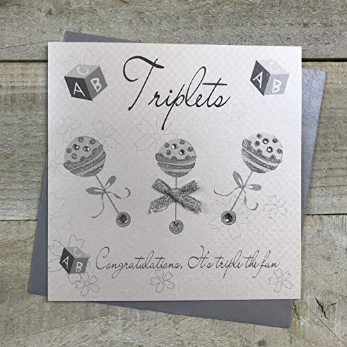 Vita bomullskort silver skallror triplets gratulations It's Triple The Fun handgjorda nytt babykort, vit, DM4
