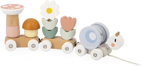 Janod Snigeltåg - 2 vagnar och 10 stycken avtagbara skallror - FSC trädra-lekleksak och vattenfärg - utveckla finmotorik - från 12 månader, J04010, flerfärgad