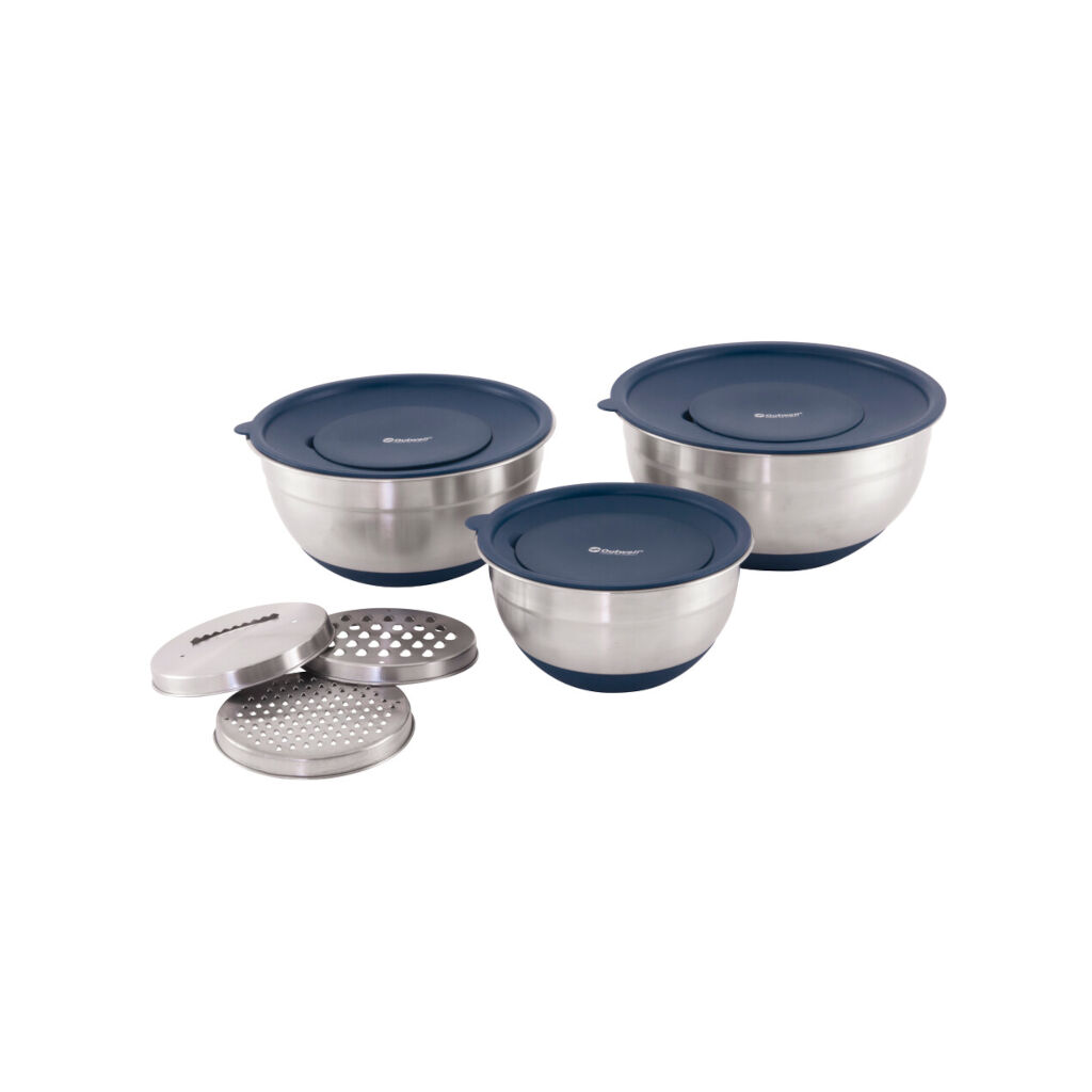 Relaxdays Skålset med lock, 3 delar, olika stora, rostfritt stål, köksskålar, skafferi, camping, blå