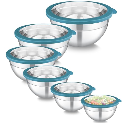Homikit blandningsskål set om 6, rostfritt stål skål salladsskål med transparent lock för servering matlagning bakning, skålset 4,5 L/2,8 L/2,5 L/1,6 L/1,2 L/0,7 L, stapelbar & diskmaskinssäker, blå