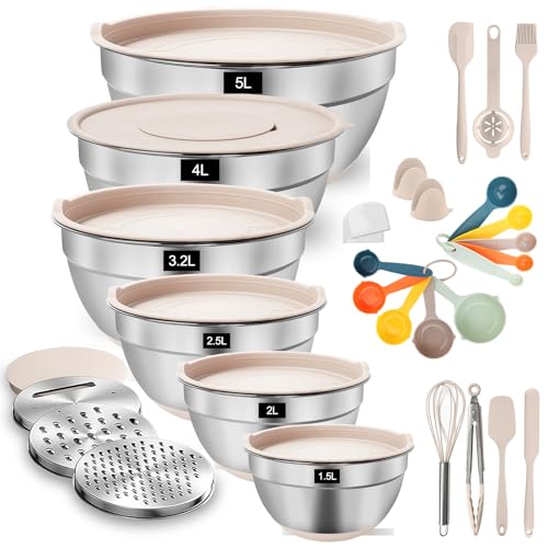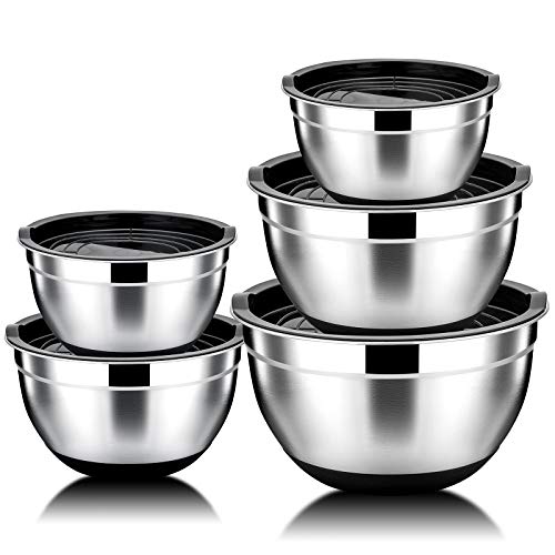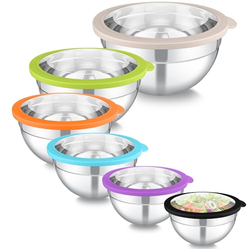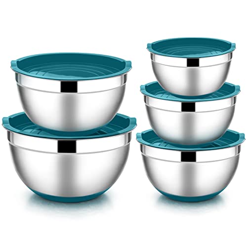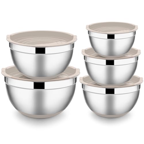 Zanfqvo blandningsskål set om 5, salladsskål i rostfritt stål med lock, storlek 0,7 l/1,1 l/1,5 l/2,7 l/4,5 l, stapelbar & diskmaskinssäker, rostfritt stål skålset för kök, bakning
