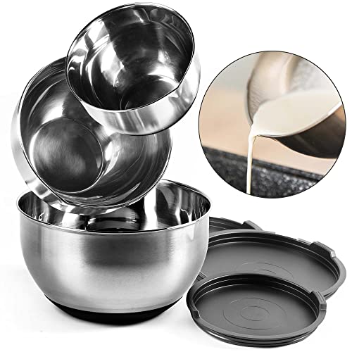 Coninx Blandningsskålset i rostfritt stål – salladsskål set om 3 med lock – rostfritt stål skålset med halkfri botten – blandningsskål diskmaskinssäker med pip och mätskala
