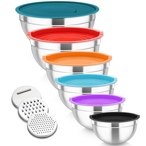 TEAMFAR blandningsskål, 6 stycken rostfria skålset med lufttätt lock och 3 rivtillbehör, salladsskål för bakning, stapelbar, diskmaskinssäker, färgglad, 4,6 l/2,8 l/2,5 l/1,6 l/1,2 l/0,7 l