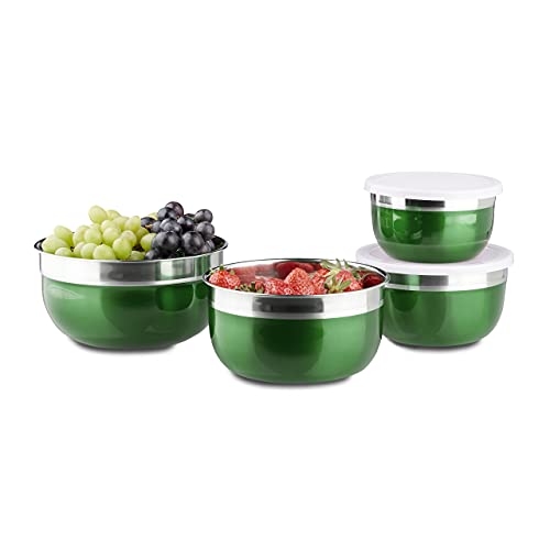 Relaxdays skålset med lock, rostfritt stål, olika storlekar, 4 delar, camping, HBT: 9 x 18,4 x 18,4 cm, grön