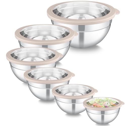 Homikit blandningsskål set om 6, rostfritt stål skål salladsskål med transparent lock för servering matlagning bakning, skålset 4,5 L/2,8 L/2,5 L/1,6 L/1,2 L/0,7 L, stapelbar & diskmaskinssäker, Khkai
