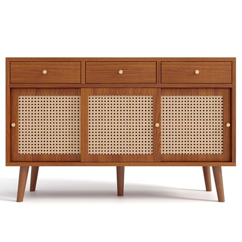 HAINEW Modern skänk med 3 rotting skjutdörrar och 3 lådor, köksskåp med ben av massivt trä och gyllene metallskalhandtag, justerbara hyllor, 120 x 40 x 78 cm (valnöt)