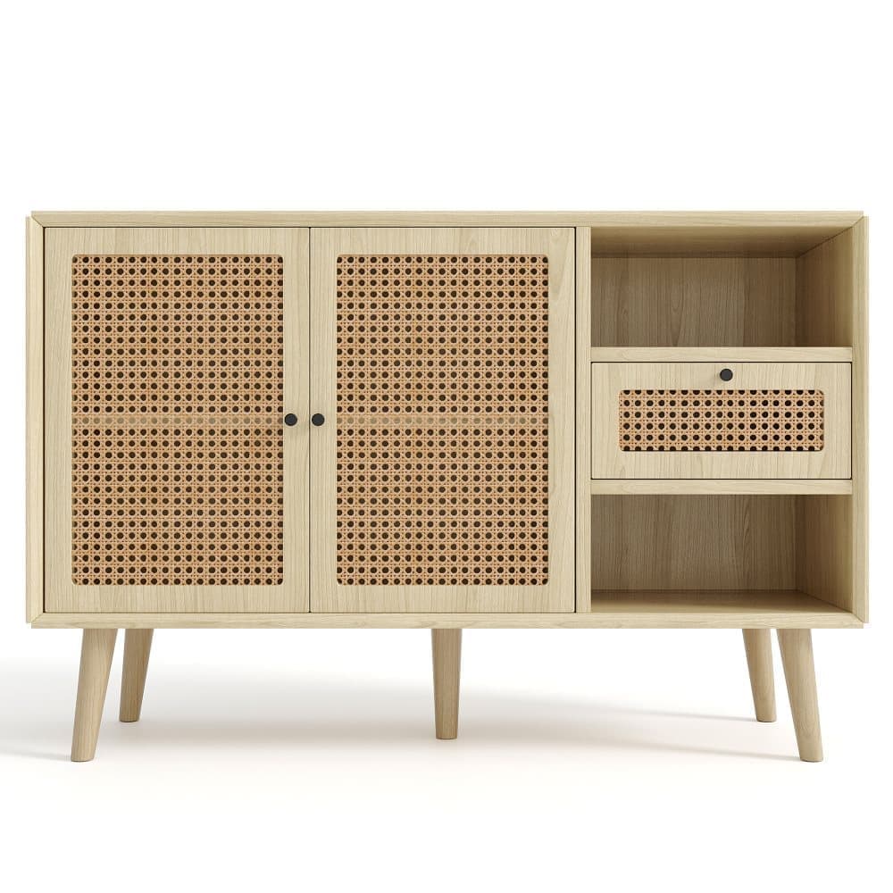 Skänk med 1 låda, 2 nischer och 3 dörrar av vävd rotting - justerbara hyllor - natur