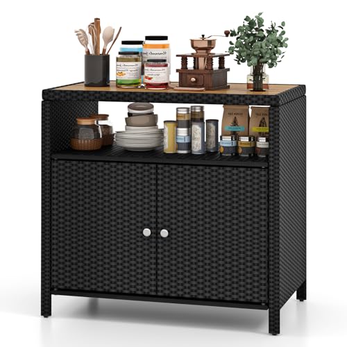 KOMFOTTEU Trädgårdsskåp i rotting, akacia trä bänkskiva skänk, korgskjul med 2 dörrar och öppen hylla, Terreza utomhusförvaringsmöbler, 90 x 53 x 66 cm (svart)