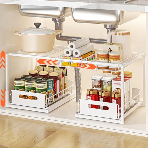 YunNasi Underskåp arrangör utdragbar 2-nivåer diskmaskin arrangör justerbar under diskbänkshylla av stål för skåp kök badrum (vit, B-stil)
