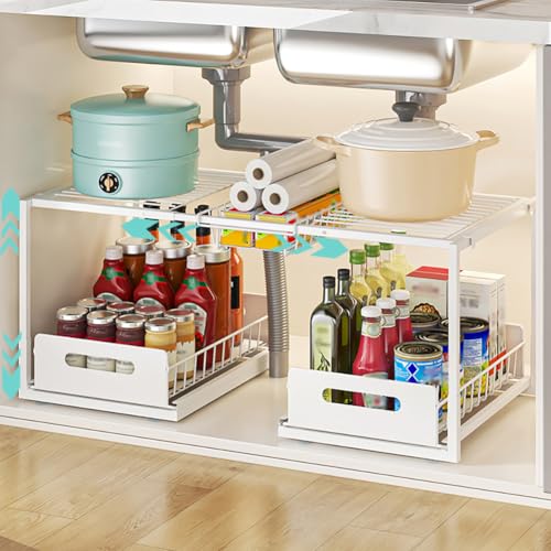 YunNasi Underskåp arrangör utdragbar 2-nivåer diskmaskin arrangör justerbar under diskbänkshylla av stål för skåp kök badrum (vit, A-stil)