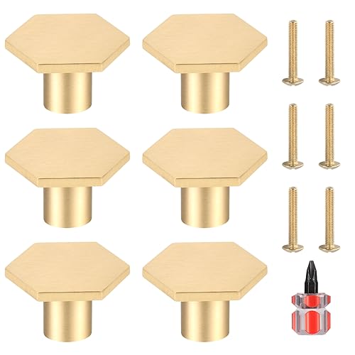 6 st dörrknopp i mässingsskåp, sexkantiga dörrknoppar i guld, lådhandtag dörrhandtag, möbelskåp låda skåp byrålhandtag och knoppar, med skruvar och skruvmejsel (3,3 x 2,1 cm)