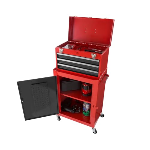 DAIMANN Professionell verktygsvagn med 3 skjutlådor och skåp med lås för garage och verkstad, målad metallram som är lätt att flytta (röd)