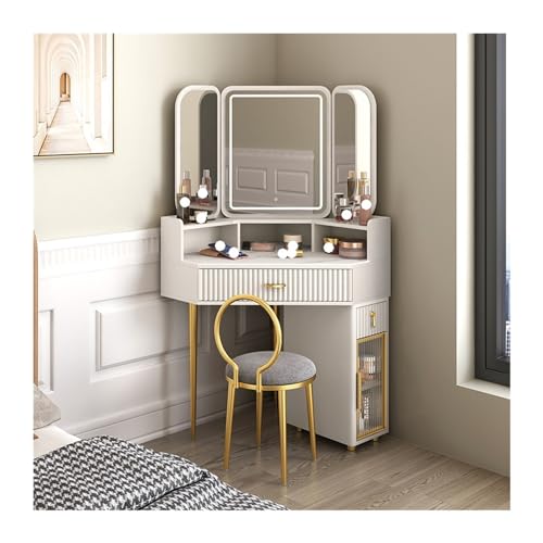 Sminkbord Hörn Sängbordsset Trä Hörnskrivbord Platssparande med förvaringsskåp och runda speglar Modern Triangel Förvaringskombination Skåp Skrivbord Sminkbord skrivbord (Size : White)