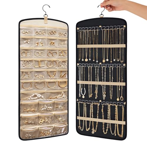 Kisvic smyckesorganisatör hängande, smyckesförvaring dubbelsidig med metallkrok, kedja förvaring för hängande örhängen halsband ringar på skåp, vägg, dörr