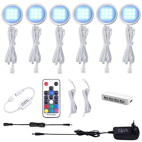 AIBOO RGB LED-skåpbelysning, set om 6, 12 V LED underbyggd lampa, färgväxling med fjärrkontroll, dimbar RGB vitrinbelysning, LED för belysning av köksskåp
