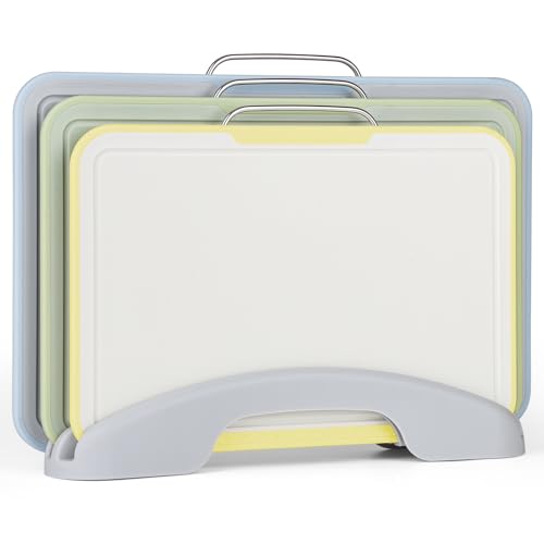 Calitek Skärbräda set med 3 BPA-fria plastskärbrädor med stativ och förvaring för mångsidig användning idealisk för kött grönsaker fruktbröd eller ostbräda (grön)