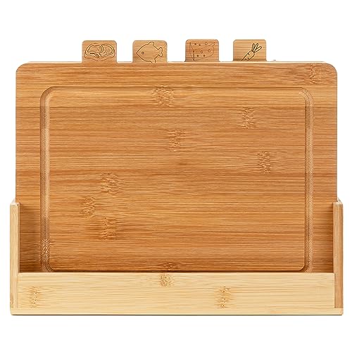 FLORINA 4-delars Set Bambu Skärbrädor med Ställ CHEF I Naturliga Bambu Skärblock med Saftspår I Antibakteriell Effekt I Universalskärbrädor lämpliga för Ost, Kött, Frukt, Grönsaker