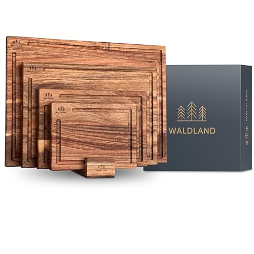 WALDLAND Premium skärbräda trä set om 4 (40 x 30, 33 x 24, 27 x 18, 21 x 15 cm) I tillverkad av robust akaciaträ I inkl. brädstativ I träbräda kök I tjocka skärbrädor med juicespår I skärbräda set