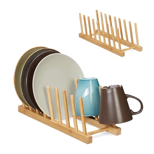 Relaxdays Tallriksställ set om 2, vardera för 10 tallrikar, grytlock, skärbrädor, bambudroppställ porslin, natur